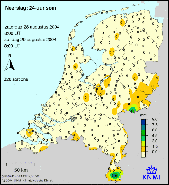 De eerste weerkaart toont de 24-uur som neer slag. De som loopt van 8:-00 tot 8:00, en wordt op 326 weerstations gemeten. Het getal geeft het aantal millimeters aan, hoeveel er deze dag is gevallen.