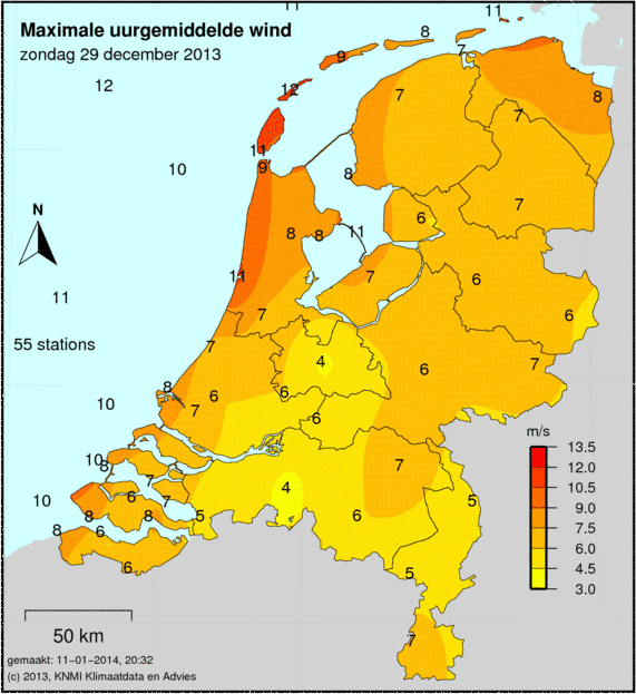 Bij windkaarten staat het maximale uurgemiddelde afgebeeld welke deze dag is gemeten. De windkracht wordt op 49 verschillende stations gemeten. Ook wordt de maximale windstoot weergegeven welke is gemeten.