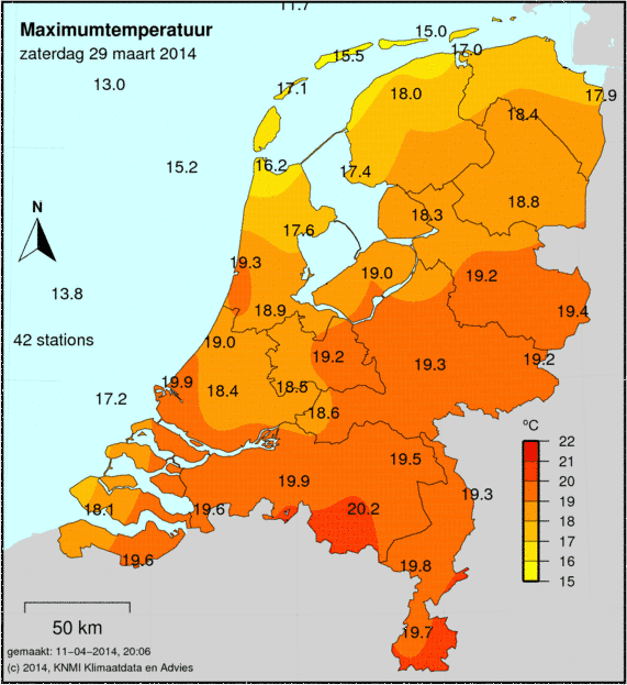 Bekijk het Weer 29 maart 2014. Hoeveel neerslag was het die dag? Wat was de maximum, minimum en gemiddelde temperatuur die dag? Hoe lang scheen de zon en wat was de windkracht? Als er die dag een sneeuwdek lag, dan zie je dit op de laatste afbeelding.