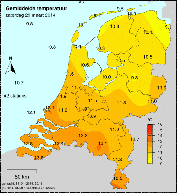Weer 29 maart 2014 met neerslag, temperatuur, wind en zonuren