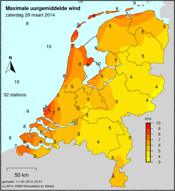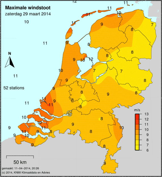 Bij windkaarten staat het maximale uurgemiddelde afgebeeld welke deze dag is gemeten. De windkracht wordt op 49 verschillende stations gemeten. Ook wordt de maximale windstoot weergegeven welke is gemeten.