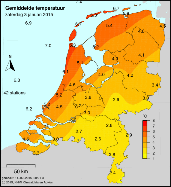 Bekijk het Weer 3 januari 2015. Hoeveel neerslag was het die dag? Wat was de maximum, minimum en gemiddelde temperatuur die dag? Hoe lang scheen de zon en wat was de windkracht? Als er die dag een sneeuwdek lag, dan zie je dit op de laatste afbeelding.