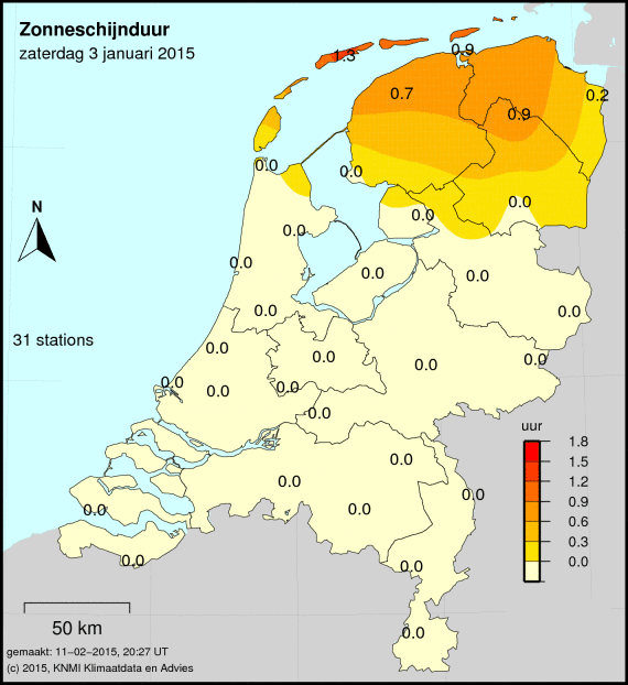 Weer 3 januari 2015 met neerslag, temperatuur, wind en zonuren