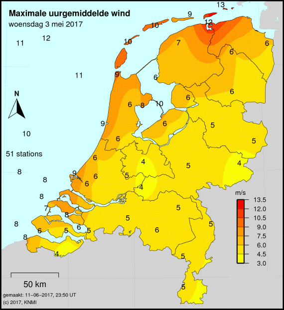 Bij windkaarten staat het maximale uurgemiddelde afgebeeld welke deze dag is gemeten. De windkracht wordt op 49 verschillende stations gemeten. Ook wordt de maximale windstoot weergegeven welke is gemeten.