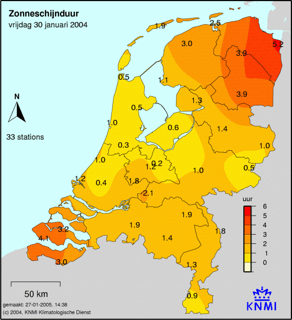 Het aantal zonuren wordt op 33 weerstations gemeten. Hoe donkerder de kleur, hoe meer zonuren er zijn gemeten. Het gemeten aantal zonuren staat op de kaart afgebeeld.