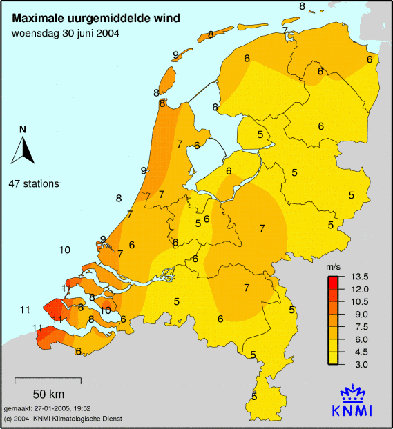 Bij windkaarten staat het maximale uurgemiddelde afgebeeld welke deze dag is gemeten. De windkracht wordt op 49 verschillende stations gemeten. Ook wordt de maximale windstoot weergegeven welke is gemeten.