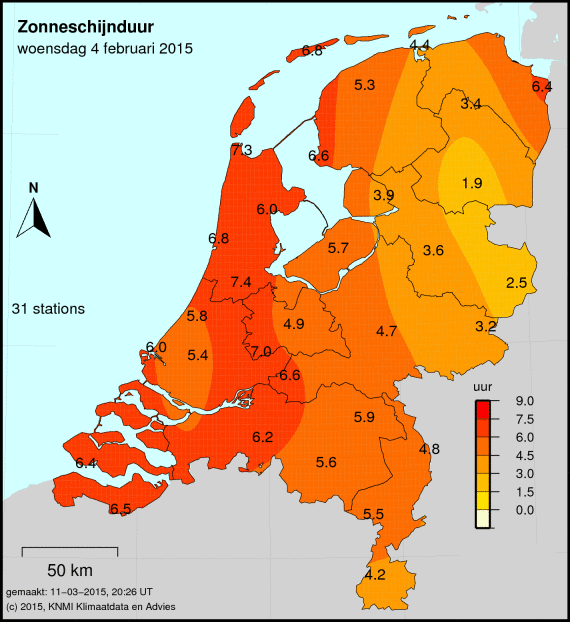 Het aantal zonuren wordt op 33 weerstations gemeten. Hoe donkerder de kleur, hoe meer zonuren er zijn gemeten. Het gemeten aantal zonuren staat op de kaart afgebeeld.