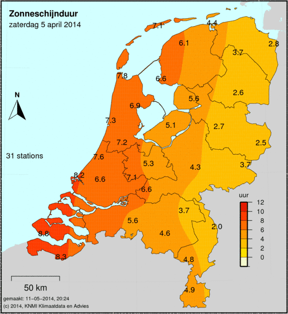 Het aantal zonuren wordt op 33 weerstations gemeten. Hoe donkerder de kleur, hoe meer zonuren er zijn gemeten. Het gemeten aantal zonuren staat op de kaart afgebeeld.