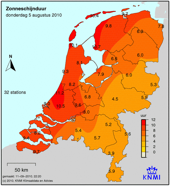 Het aantal zonuren wordt op 33 weerstations gemeten. Hoe donkerder de kleur, hoe meer zonuren er zijn gemeten. Het gemeten aantal zonuren staat op de kaart afgebeeld.