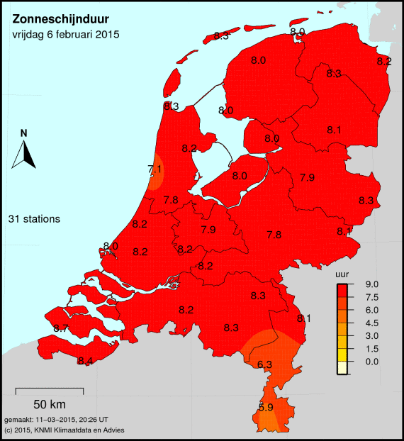 Het aantal zonuren wordt op 33 weerstations gemeten. Hoe donkerder de kleur, hoe meer zonuren er zijn gemeten. Het gemeten aantal zonuren staat op de kaart afgebeeld.