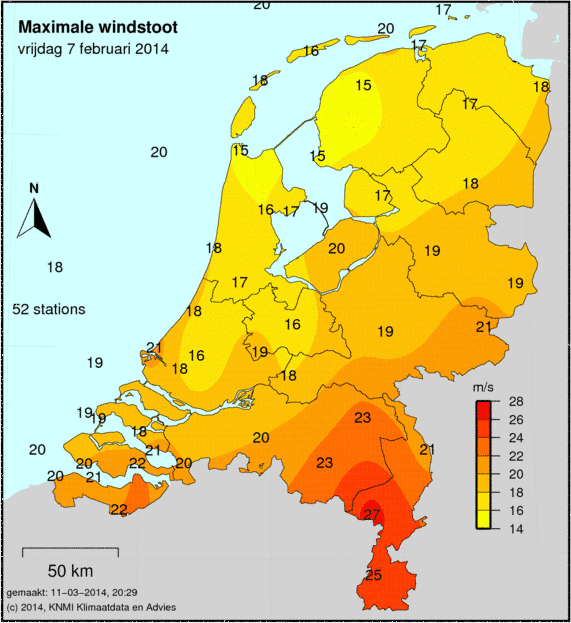 Bij windkaarten staat het maximale uurgemiddelde afgebeeld welke deze dag is gemeten. De windkracht wordt op 49 verschillende stations gemeten. Ook wordt de maximale windstoot weergegeven welke is gemeten.