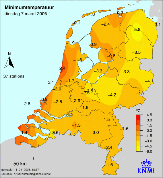 Bekijk het Weer 7 maart 2006. Hoeveel neerslag was het die dag? Wat was de maximum, minimum en gemiddelde temperatuur die dag? Hoe lang scheen de zon en wat was de windkracht? Als er die dag een sneeuwdek lag, dan zie je dit op de laatste afbeelding.
