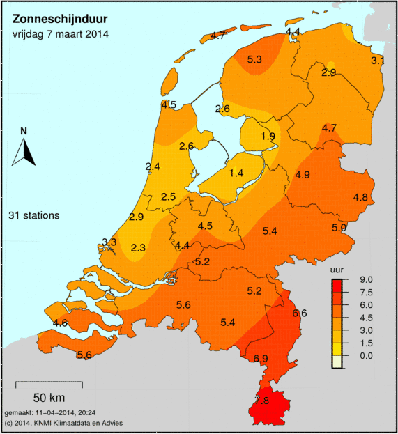Het aantal zonuren wordt op 33 weerstations gemeten. Hoe donkerder de kleur, hoe meer zonuren er zijn gemeten. Het gemeten aantal zonuren staat op de kaart afgebeeld.