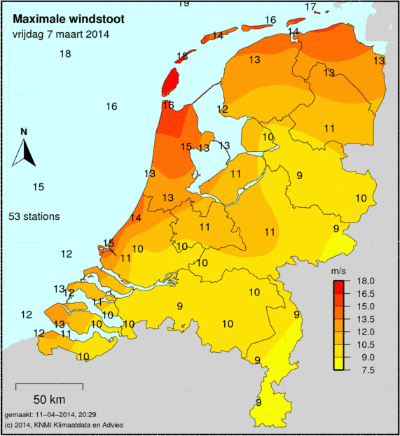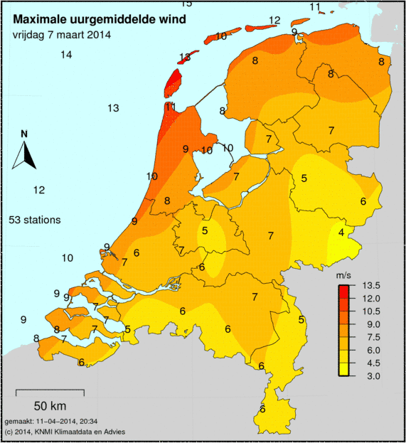 Bij windkaarten staat het maximale uurgemiddelde afgebeeld welke deze dag is gemeten. De windkracht wordt op 49 verschillende stations gemeten. Ook wordt de maximale windstoot weergegeven welke is gemeten.
