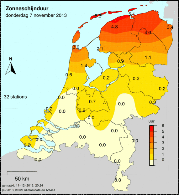 Het aantal zonuren wordt op 33 weerstations gemeten. Hoe donkerder de kleur, hoe meer zonuren er zijn gemeten. Het gemeten aantal zonuren staat op de kaart afgebeeld.