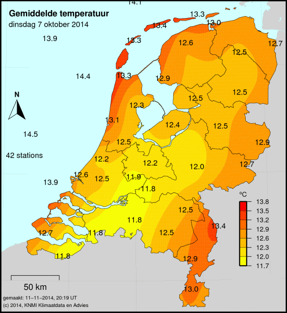 Bekijk het Weer 7 oktober 2014. Hoeveel neerslag was het die dag? Wat was de maximum, minimum en gemiddelde temperatuur die dag? Hoe lang scheen de zon en wat was de windkracht? Als er die dag een sneeuwdek lag, dan zie je dit op de laatste afbeelding.