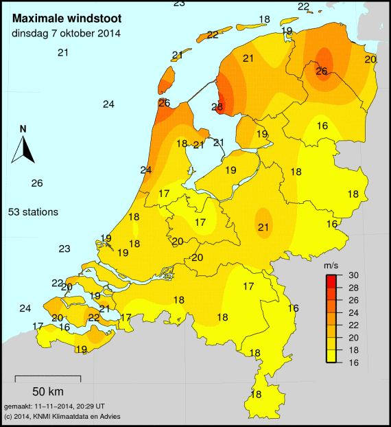 Bij windkaarten staat het maximale uurgemiddelde afgebeeld welke deze dag is gemeten. De windkracht wordt op 49 verschillende stations gemeten. Ook wordt de maximale windstoot weergegeven welke is gemeten.