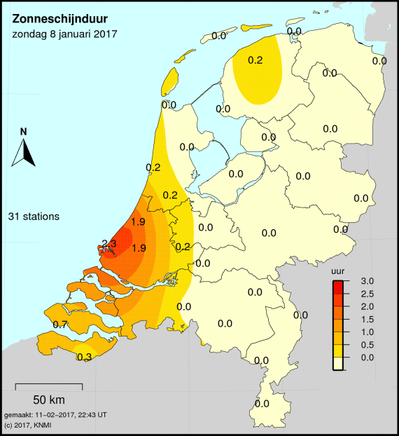Het aantal zonuren wordt op 33 weerstations gemeten. Hoe donkerder de kleur, hoe meer zonuren er zijn gemeten. Het gemeten aantal zonuren staat op de kaart afgebeeld.