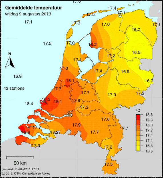 Bekijk het Weer 9 augustus 2013. Hoeveel neerslag was het die dag? Wat was de maximum, minimum en gemiddelde temperatuur die dag? Hoe lang scheen de zon en wat was de windkracht? Als er die dag een sneeuwdek lag, dan zie je dit op de laatste afbeelding.