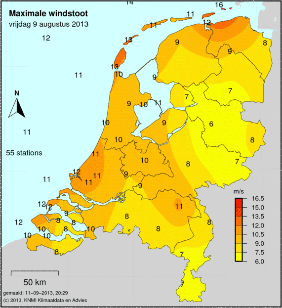 Bij windkaarten staat het maximale uurgemiddelde afgebeeld welke deze dag is gemeten. De windkracht wordt op 49 verschillende stations gemeten. Ook wordt de maximale windstoot weergegeven welke is gemeten.