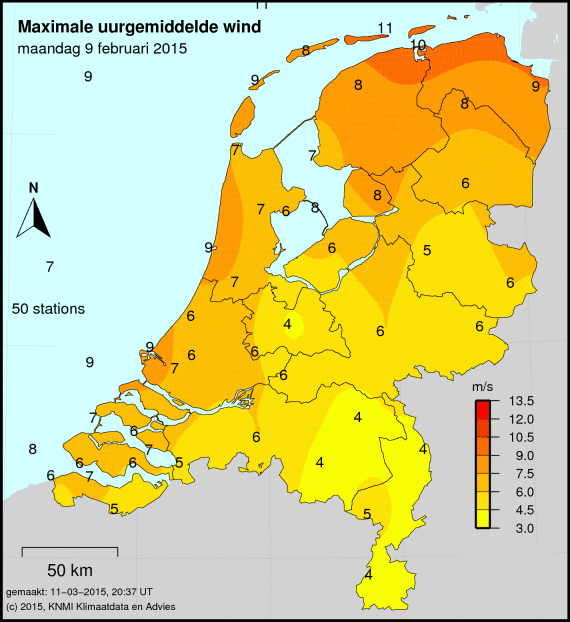 Bij windkaarten staat het maximale uurgemiddelde afgebeeld welke deze dag is gemeten. De windkracht wordt op 49 verschillende stations gemeten. Ook wordt de maximale windstoot weergegeven welke is gemeten.