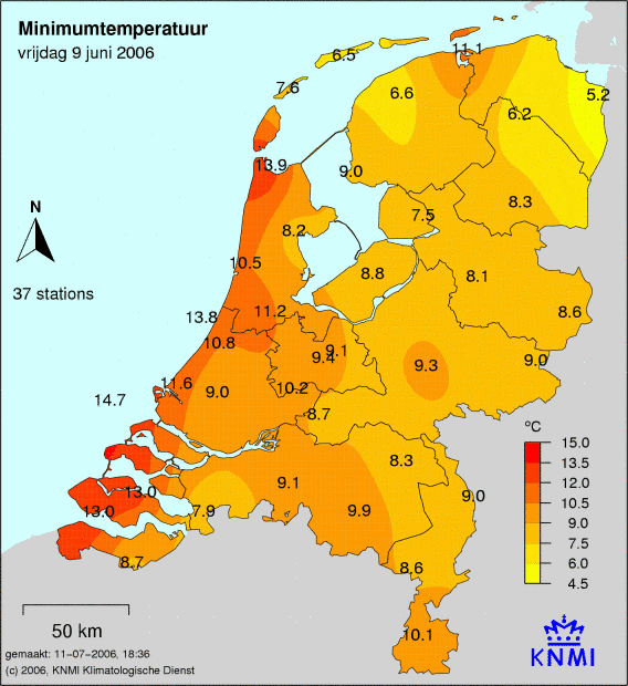 Bekijk het Weer 9 juni 2006. Hoeveel neerslag was het die dag? Wat was de maximum, minimum en gemiddelde temperatuur die dag? Hoe lang scheen de zon en wat was de windkracht? Als er die dag een sneeuwdek lag, dan zie je dit op de laatste afbeelding.